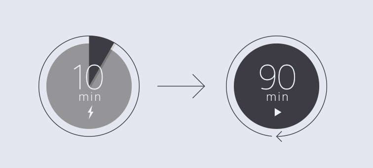 Czasem musisz jak najszybciej posłuchać muzyki. Jeśli więc poziom akumulatora w słuchawkach jest niski, 10-minutowe ładowanie da nawet 90 minut odtwarzania.