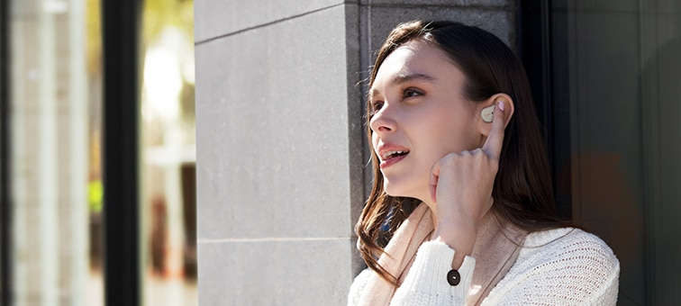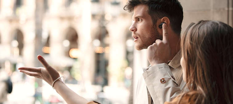 Umieszczenie palca na wkładce dousznej zmniejsza poziom głośności i wzmacnia dźwięki otoczenia. Dzięki temu możesz natychmiast porozmawiać z kimś bez zdejmowania słuchawek.
