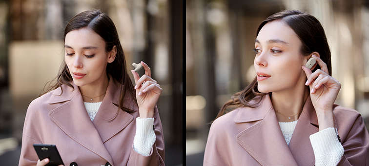 Czujnik zbliżeniowy w każdej wkładce wykrywa, czy używasz jednej, czy obu słuchawek, i odpowiednio ustawia odtwarzanie. Wyjmij jedną ze słuchawek z ucha, a muzyka zostanie wstrzymana automatycznie po obu stronach. Włóż ponownie wkładkę douszną, a muzyka automatycznie zacznie znowu grać.